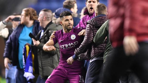 Atacantul cetățenilor, Kun Aguero nu s-a putut abține și a lovit un fan al gazdelor intrat pe teren pentru a sărbători victoria.