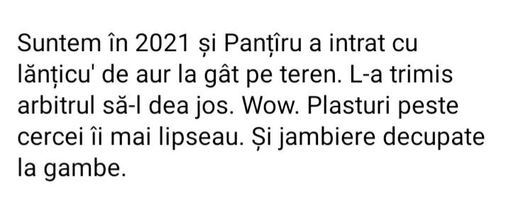 Ideea este că bloggerul îl denigra în ultimul hal pe fotbalistul FCSB-ului, în uralele urmăritorilor de pe pagina sa de Facebook, fără fond, ci doar pentru că Panțîru s-a întors înainte de a intra pe teren, să își lase lanțul de la gât, atât.